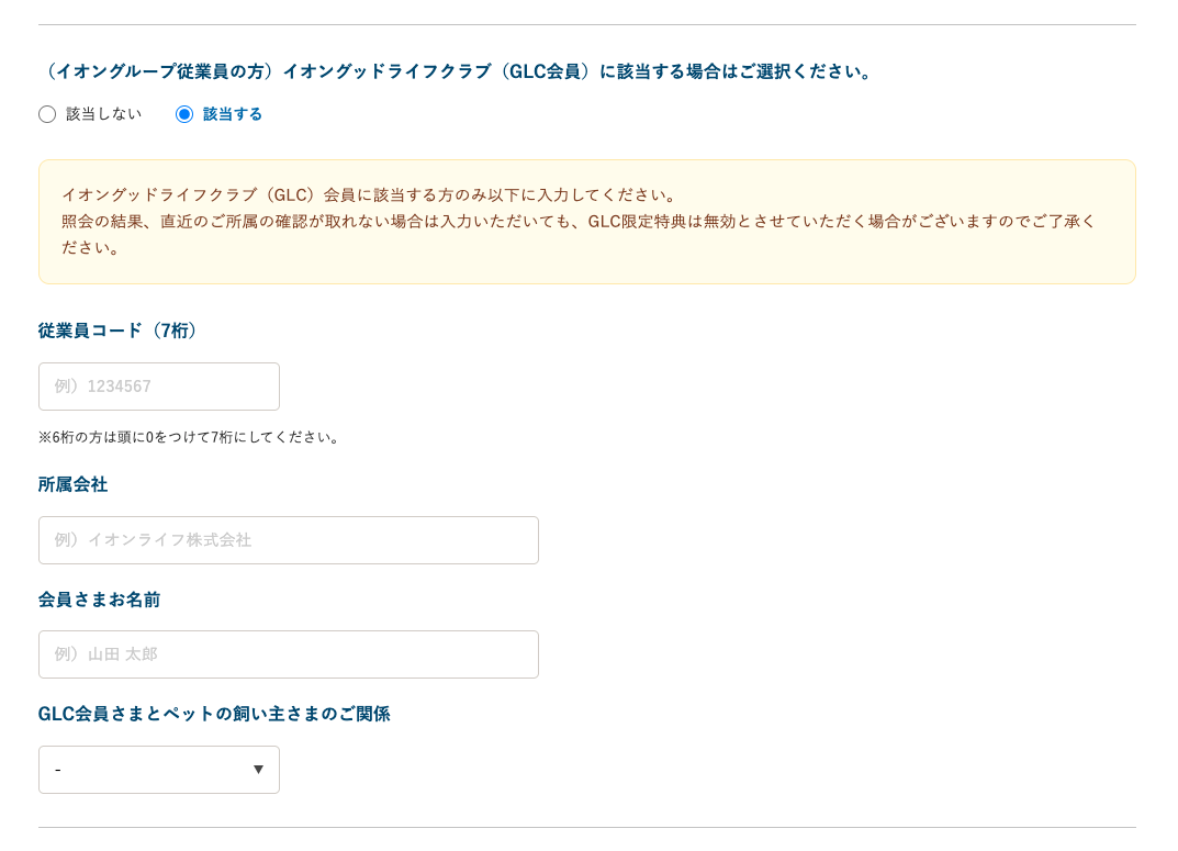 (GLC会員に”該当する”をご選択いただくと追加の入力枠が表示されます。)